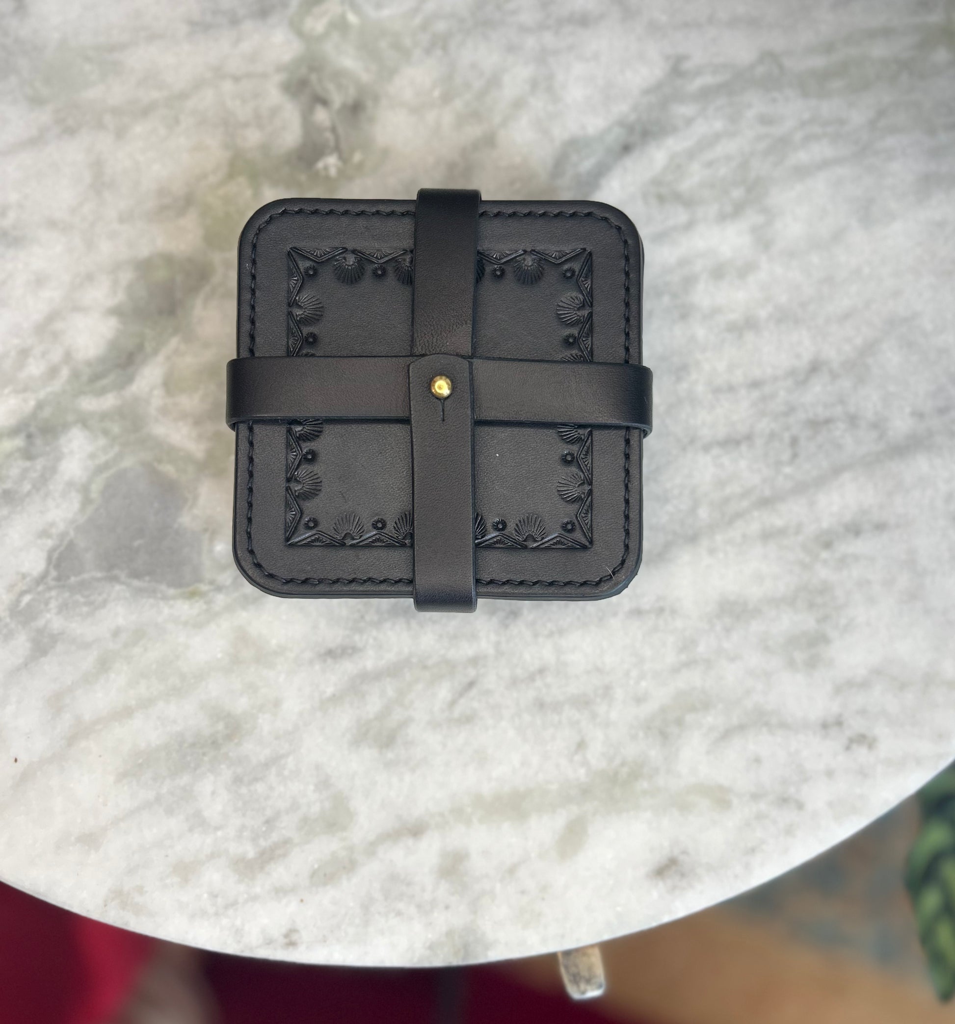 Black Leather Coaster set, featuring a border stamp face, with a suede backing. Each coaster was hand stitched and the set comes with a leather harness when not in use.