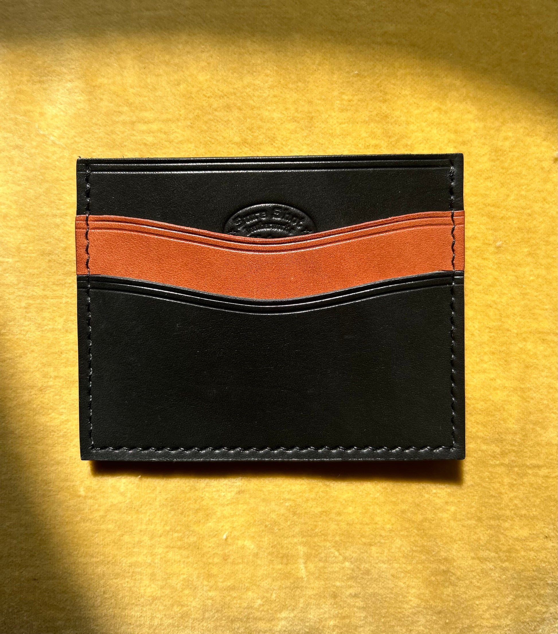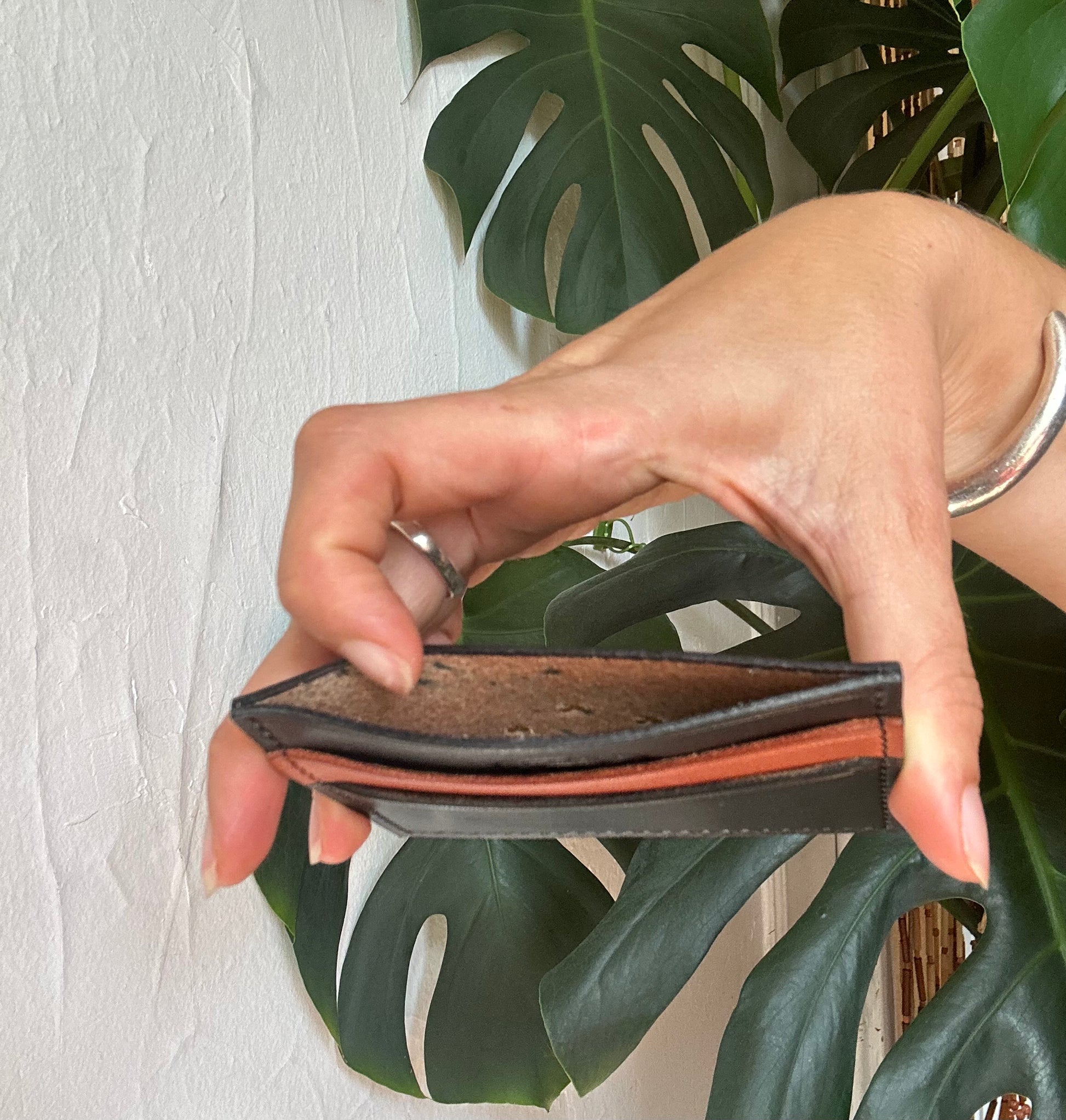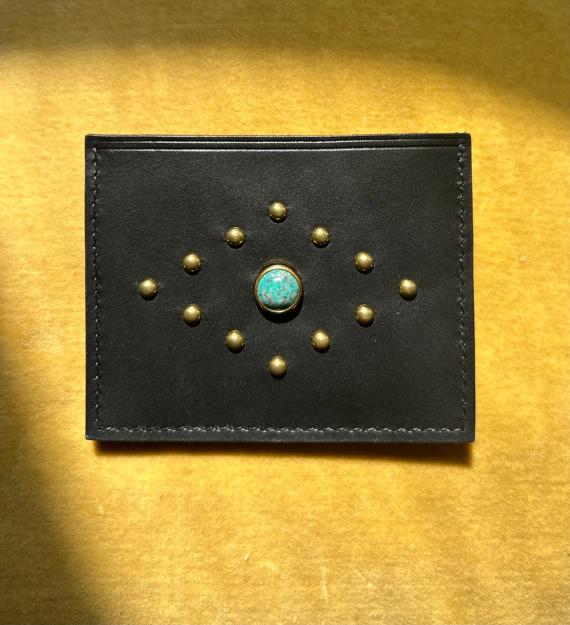 Hand Dyed black leather, adorned with brass studs and a real turquoise cabochon. Features a center card slot and two card pockets- in a two tone design.