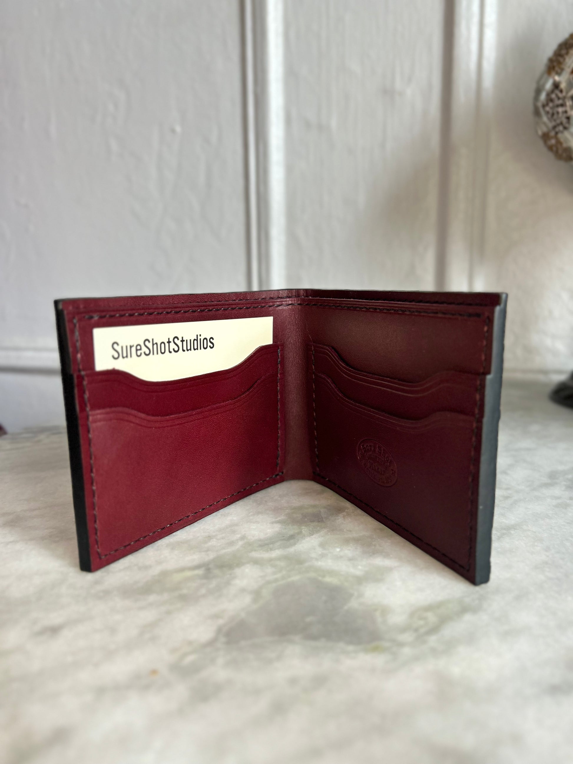 This wallet is a true heirloom! Ostrich Embossed Italian Leather, with a rich, deep red interior. Two card slots on each side, as well as a large interior cash pocket. Hand stitched and built to last.